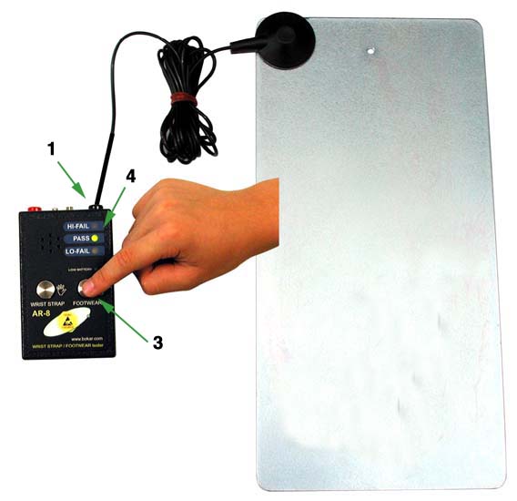 The wrist strap and footwear tester was created to fill a growing demand for a dependable, low cost and easy-to-use test mechanism for personnel grounding devices. It is available as AR-8A Tester, (U.S. standards) a 750-kohms to 10-Mohms range for wrist straps and 750kohms to 100Mohms range for footwear and AR-8E Tester (European standards) a 750-kohms to 35-Mohms range for both wrist straps and footwear.